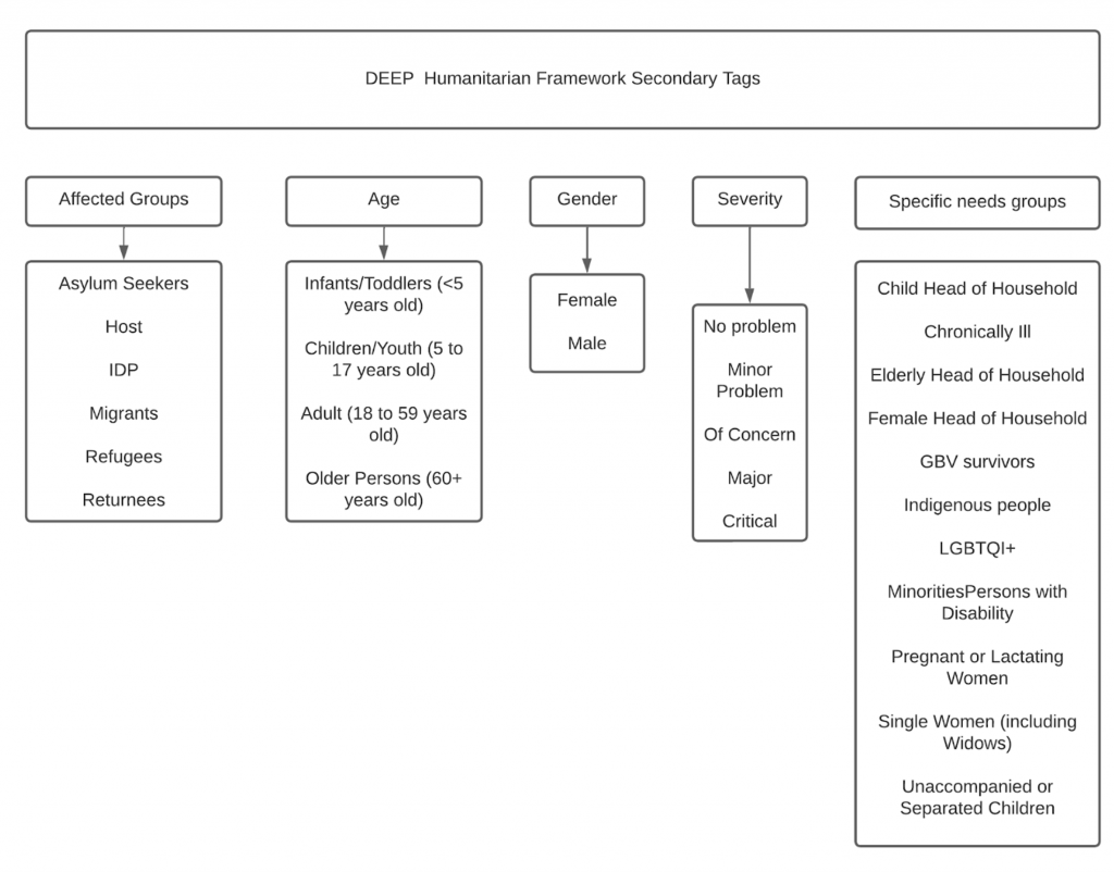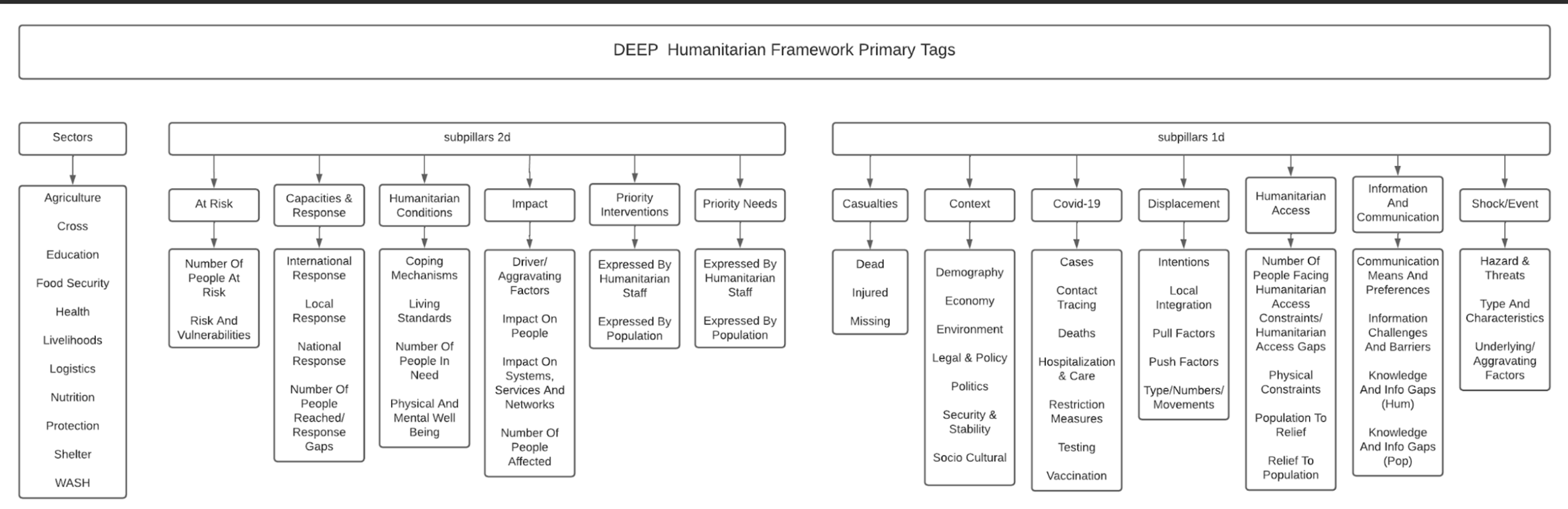 We developed a multi-label classification model tailored for common humanitarian analysis frameworks and trained on DEEP data with direct access in the DEEP and a pluggable interface for other applications. The assisted tagging gives automatic suggestions on which tag to choose from according to the analysis framework. This helps speed up the annotation process.