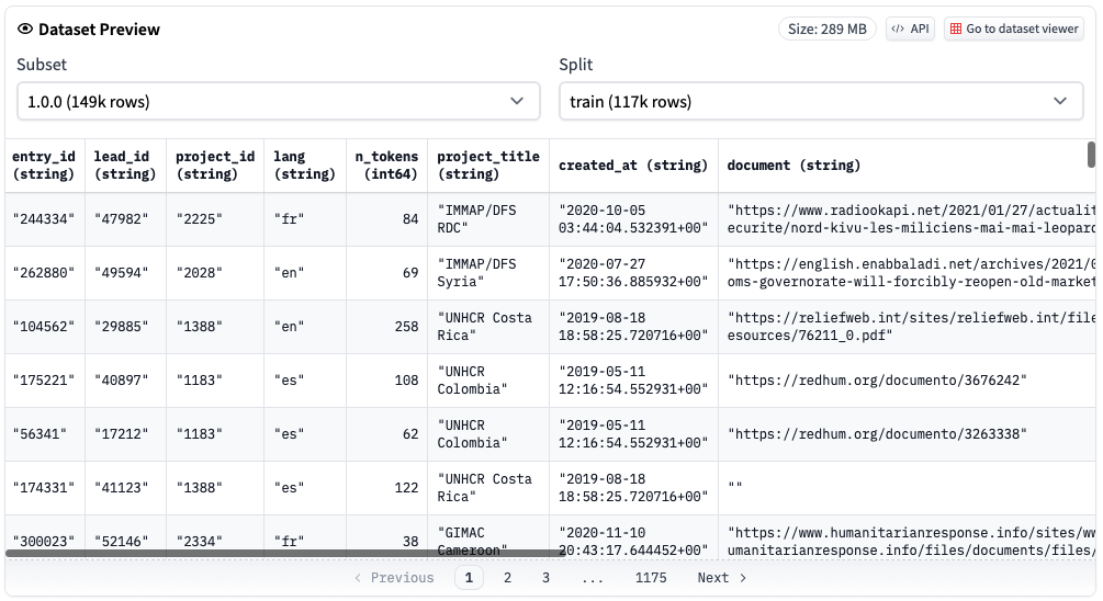 HumSet is a novel and rich multilingual dataset of humanitarian response documents annotated by experts in the humanitarian response community. HumSet is curated by humanitarian analysts and covers various disasters around the globe that occurred from 2018 to 2021 in 46 humanitarian response projects. The dataset consists of approximately 17K annotated documents in three languages of English, French, and Spanish, originally taken from publicly-available resources. For each document, analysts have identified informative snippets (entries) in respect to common humanitarian frameworks, and assigned one or many classes to each entry. See the our paper for details.